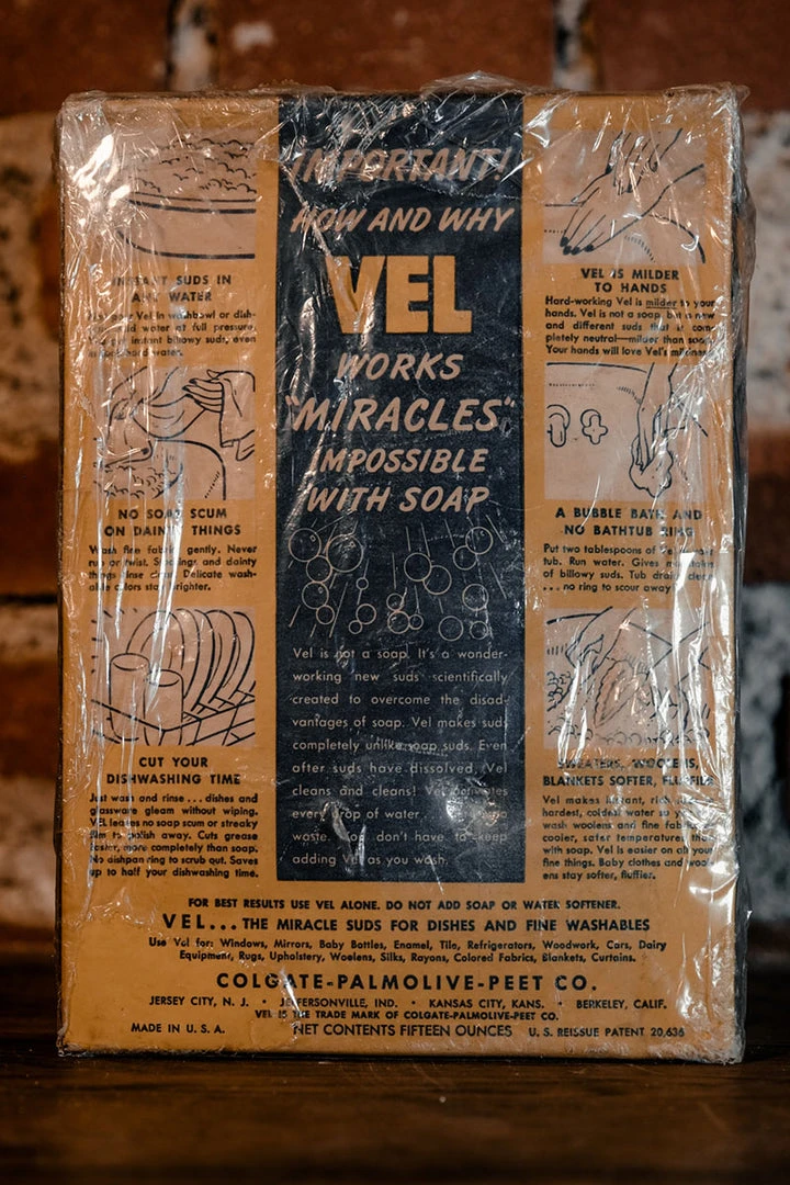 Vel was one of the first synthetic detergents. Before detergents were invented, people used soap flakes or powdered soap to do laundry. Besides being sticky and hard to dissolve, soap makes lots of suds, so it was poorly suited for automatic washing machines. Most people did laundry in a tub of hot water or wringer washer.