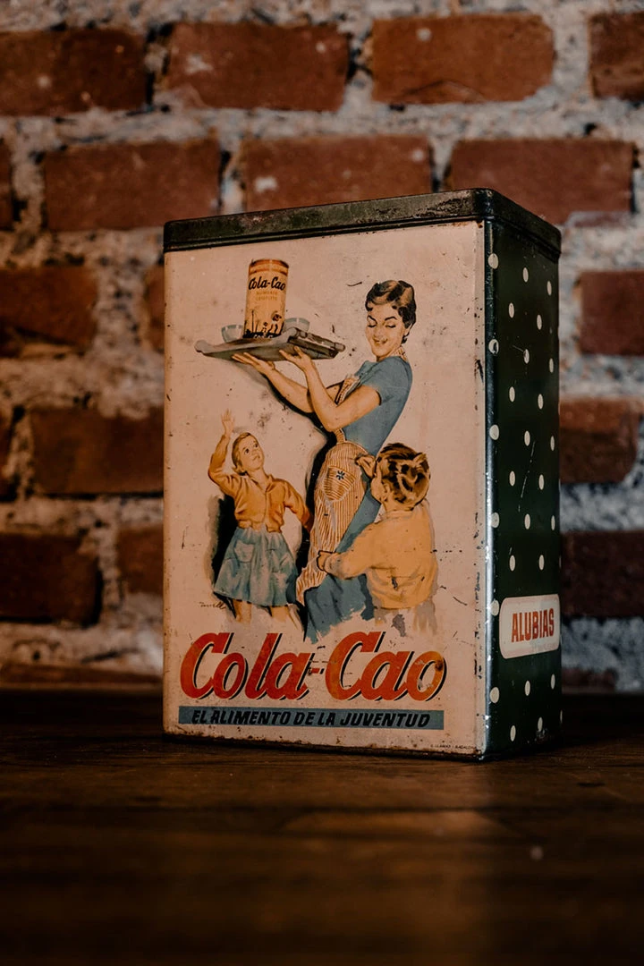 1960’s lithographic print advertising “Cola-Cao” tin metal box with hinged lid. Made in Barcelona Spain. “Cola-Cao”, a chocolate flavored beverage, first originated in Spain in 1946. Nice collectible, not easy to find.