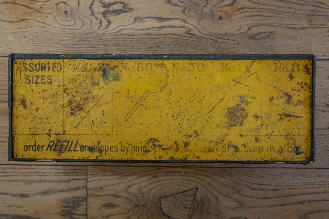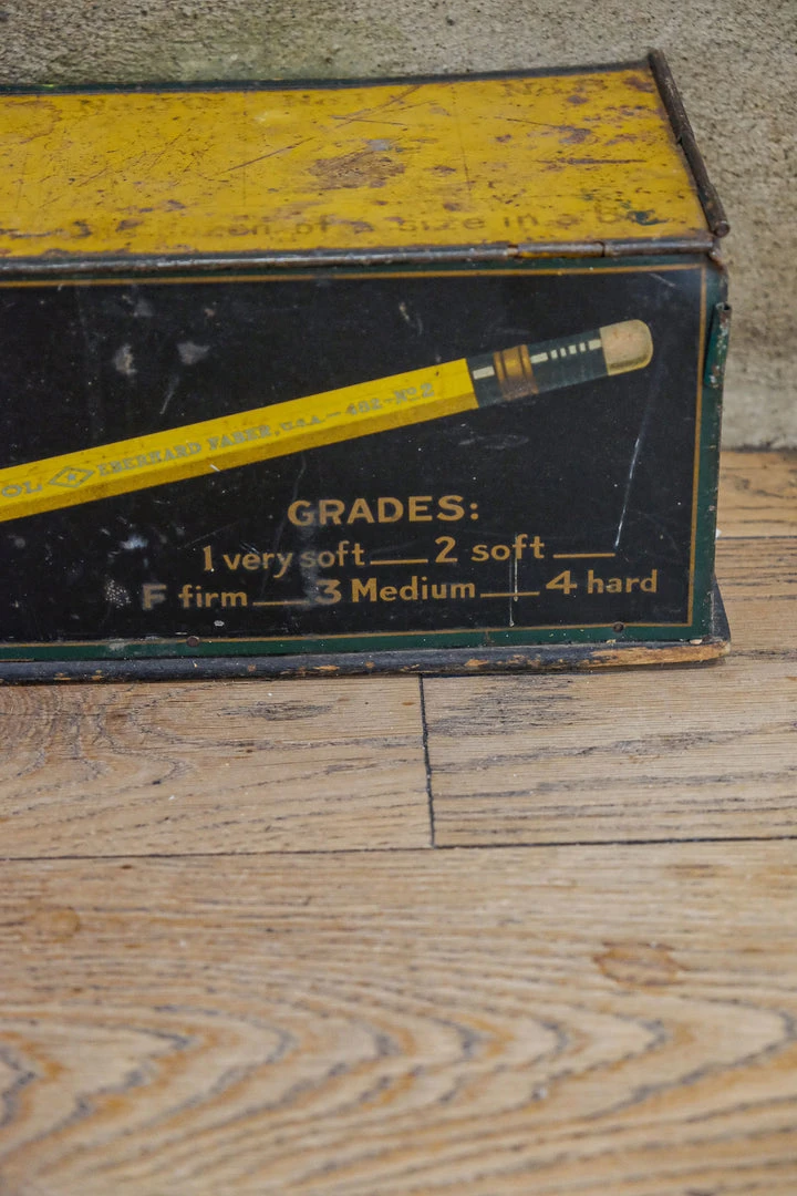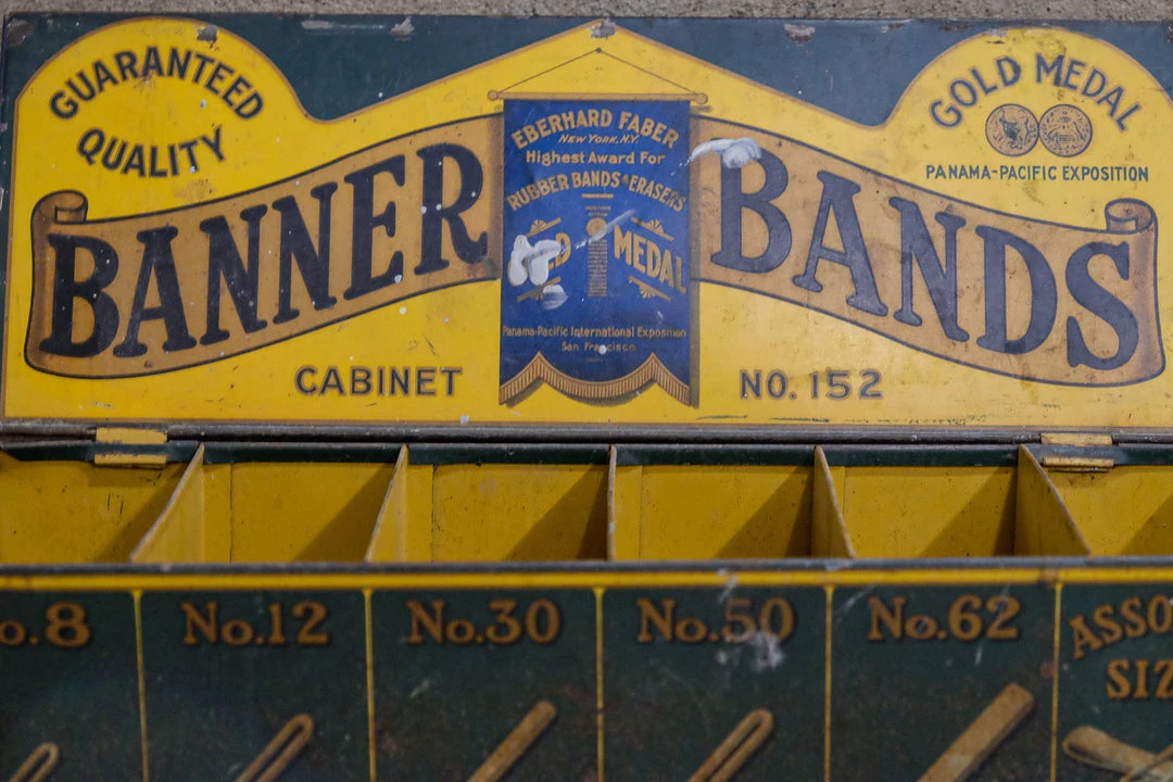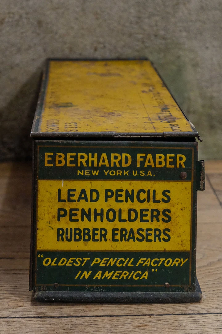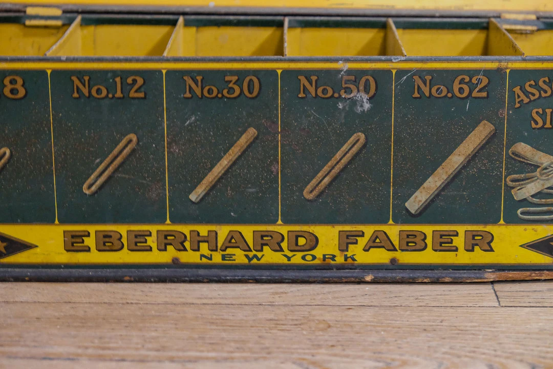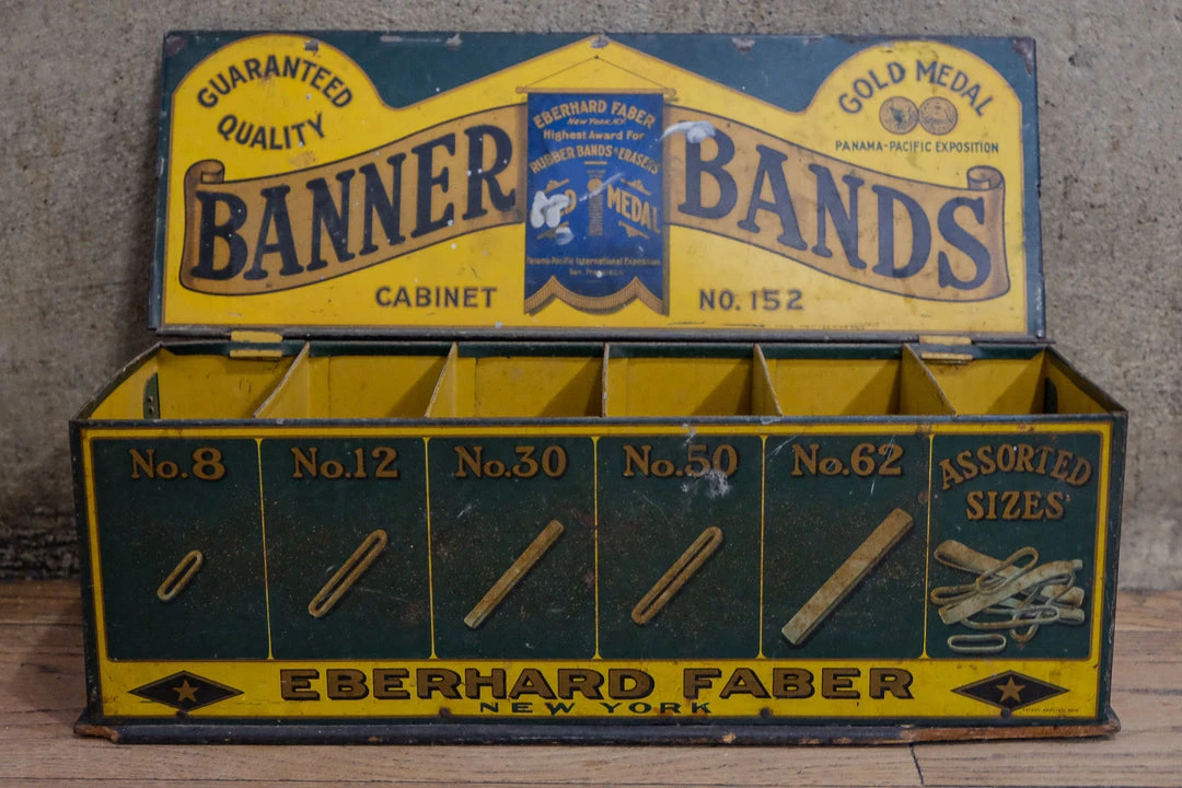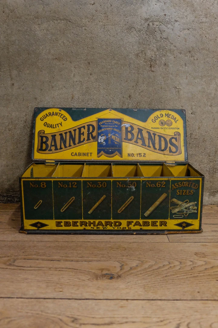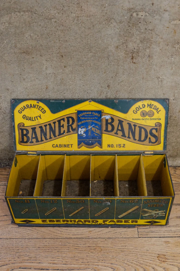 Vintage advertising countertop metal display case for Eberhard Faber Banner Bands . The metal hinged lid opens to reveal 6 sections.