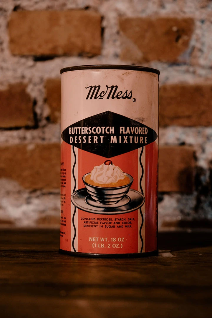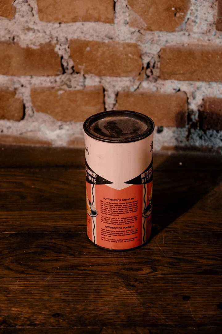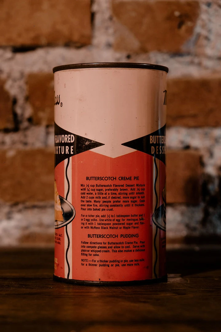 Vintage bright and vibrant can. Butterscotch mixture, can is empty. Cans listed as net weight 18 oz. (1 lb). Great colorful graphics on the tin, both front and back. Instructions for preparation on one side of tin. Great for display on shelf.Â