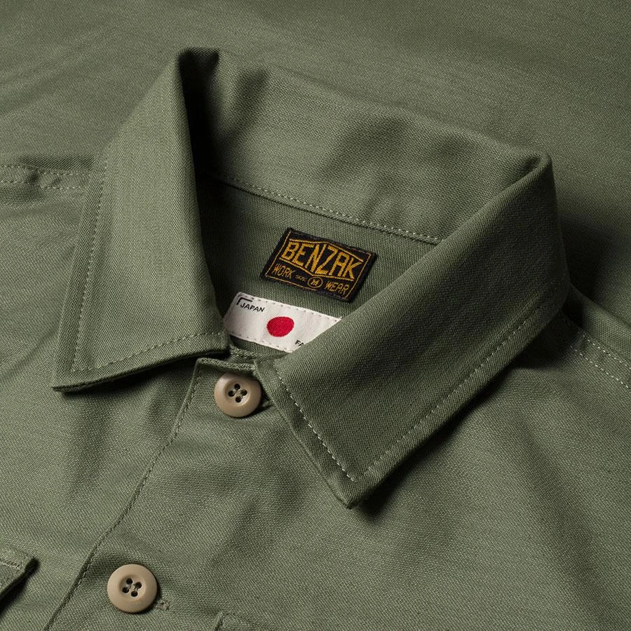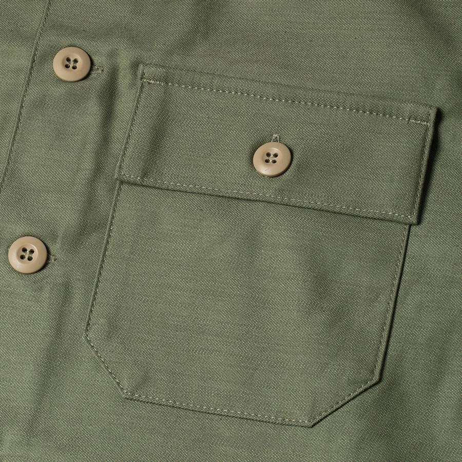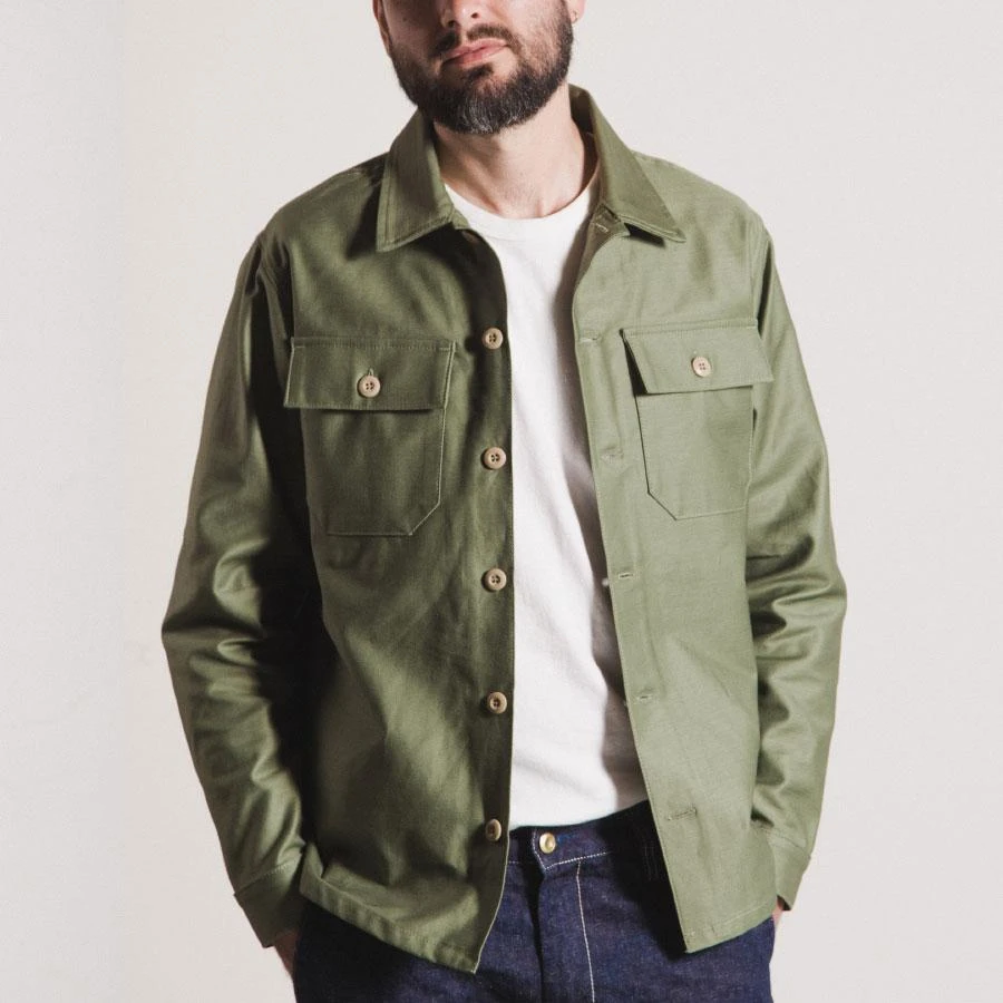 The BWS-03 Military Overshirt is a versatile shirt that can both function as shirt and jacket, depending on the season. This makes this overshirt perfect for layering. The design is simple yet utilitarian and takes inspiration from a 60s military shirt style. It features two large chest pockets with rectangular flaps. The cuff slits are finished with a continuous strip for durability, and the bottom is cut straight.