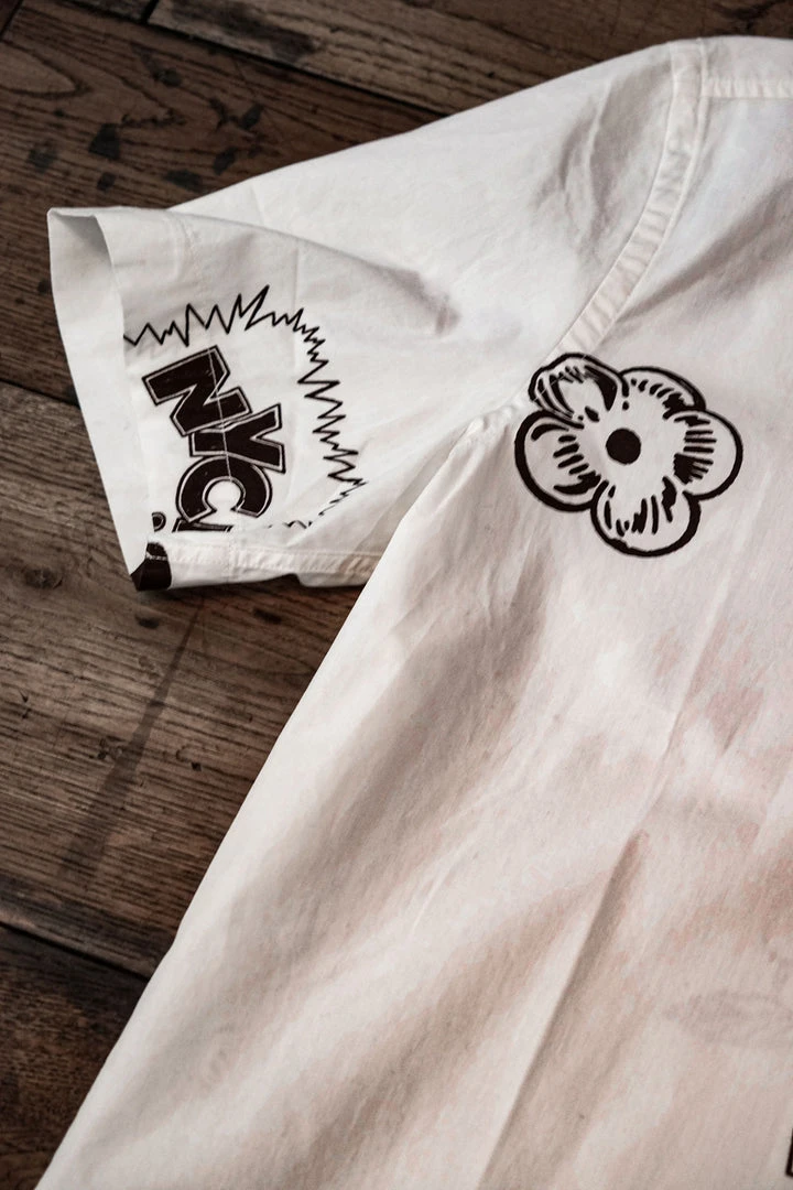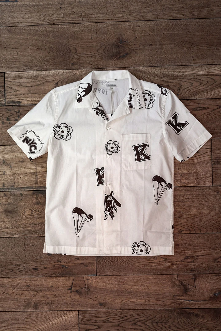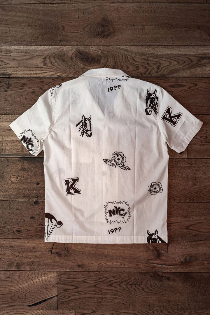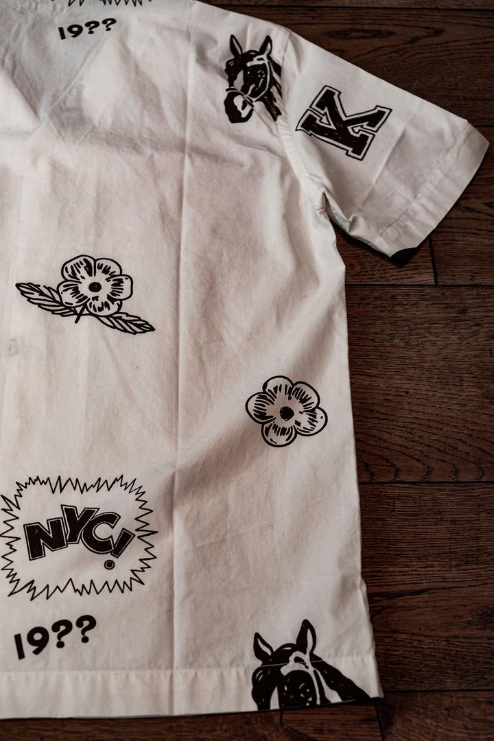 The ? camp shirt is a limited edition print with artwork illustrated by Joshua Minnich. A bit of randomness, hence the “?”, the pattern is reminiscent of what you may find from the american graffiti of old usn and usmc uniforms. The collar of this silhouette is patterned to be worn open or buttoned to the top. the buttons are the clean and classic mother of pearl, which we typically opt for to keep the authentic look of the camp shirt.