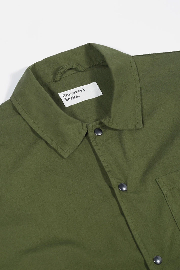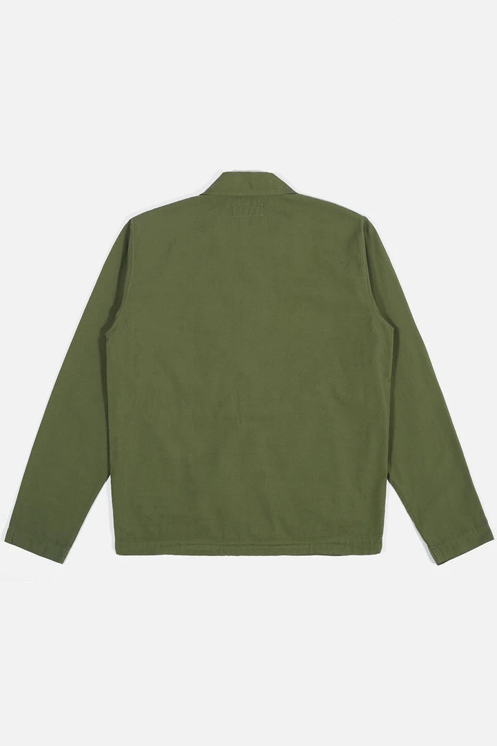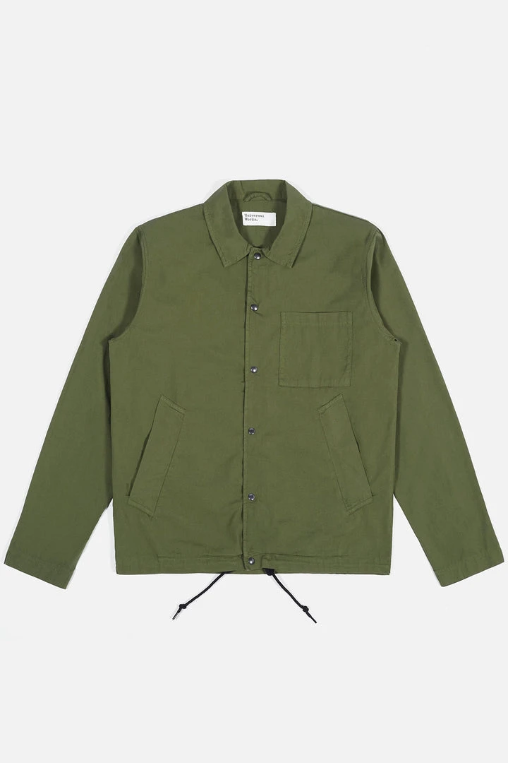 A snap-front closure classic “coach” jacket, with large hand pockets, mid-length and loose-fitting. A super-fine canvas weave made with slub cotton yarn, made for us in Italy.